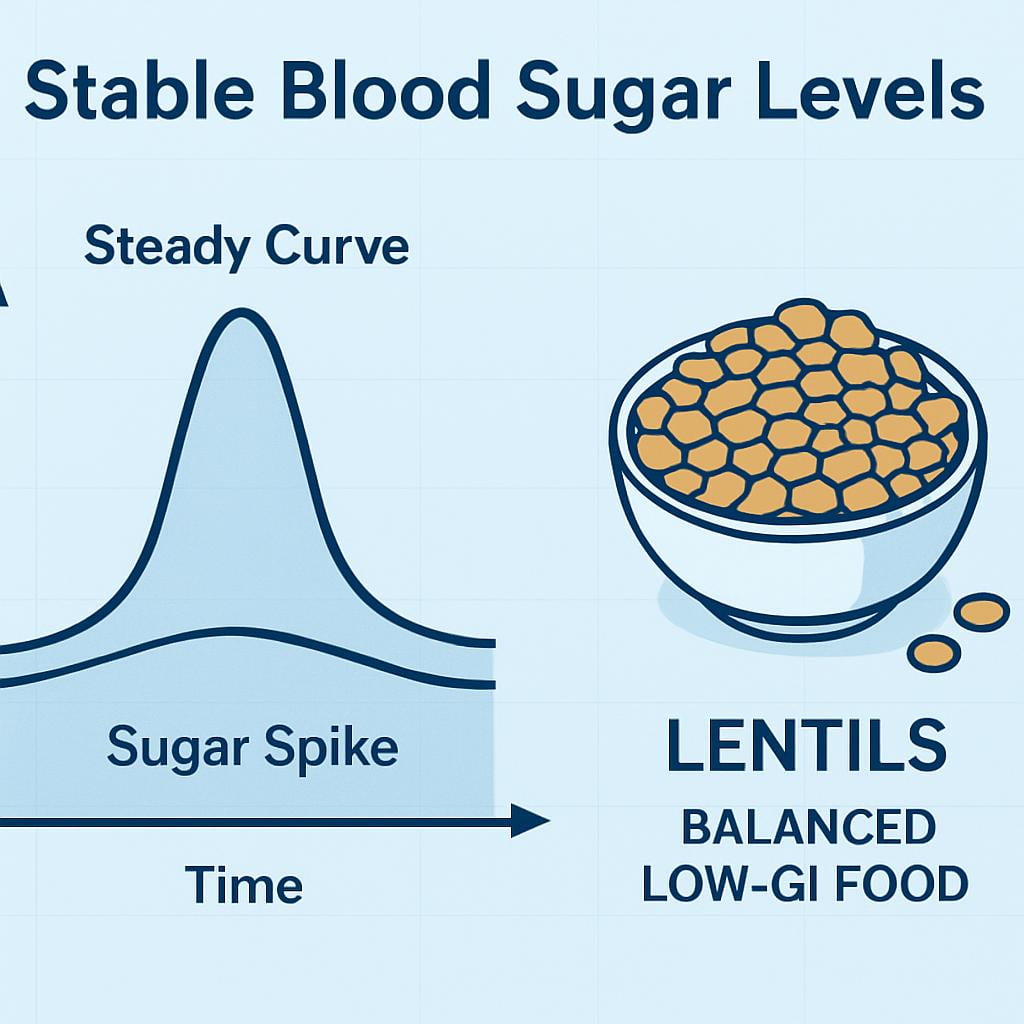 Lentils have a low glycemic index (GI), meaning they release glucose slowly into the bloodstream, helping maintain steady energy and prevent sugar spikes.