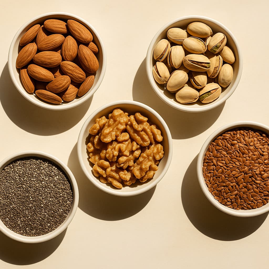 Almonds, walnuts, pistachios, chia seeds, and flaxseeds are nutrient-dense sources of healthy fats, fiber, and plant-based protein. Although they are higher in calories, research from the National Library of Medicine shows that regular nut consumption is associated with stable weight over time, possibly due to their strong satiety effect. Mindful portions—such as a small handful—can help maximize benefits without excess calories.