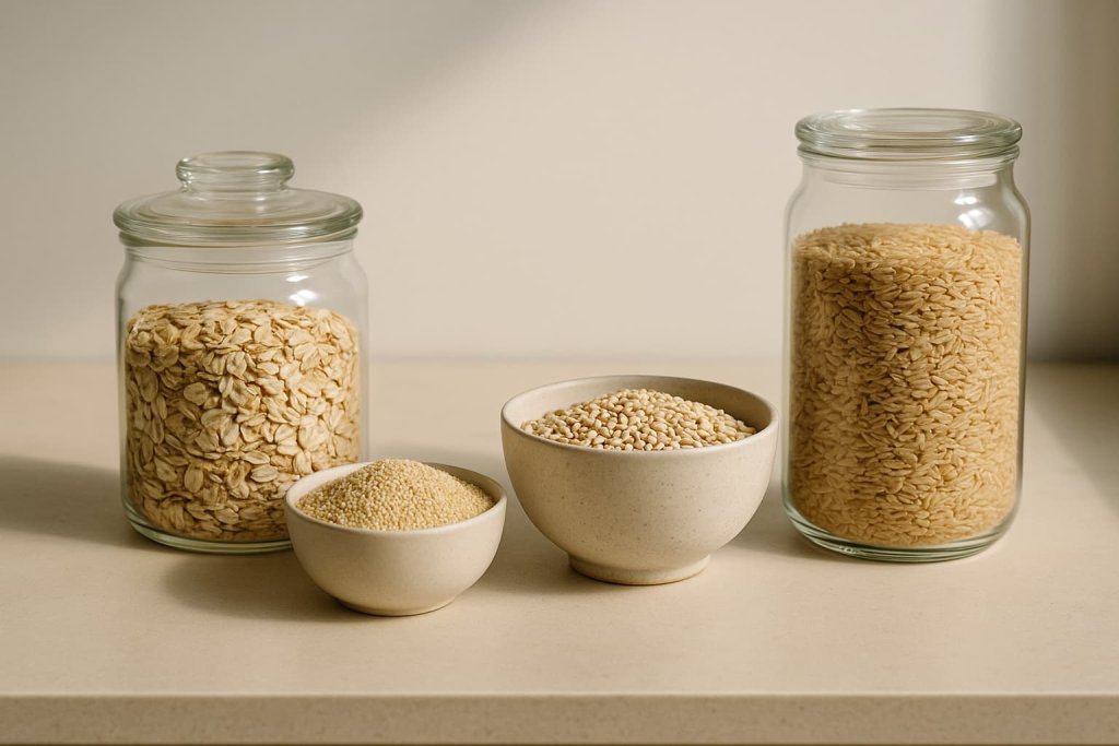 Whole grains such as oats, quinoa, barley, and brown rice are rich in fiber and essential nutrients. They digest more slowly than refined grains, which may help support steady energy and reduce cravings. The Dietary Guidelines for Americans recommend making at least half of all grains whole grains to support overall metabolic and nutritional health. Oats, in particular, contain beta-glucan, a soluble fiber linked with improved fullness.