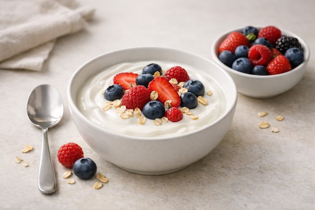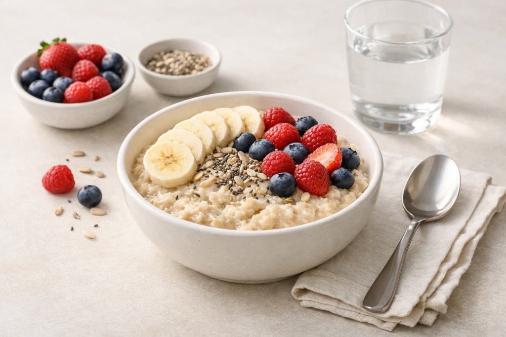 A simple bowl of oatmeal with yogurt and berries is an easy gut-supportive meal.