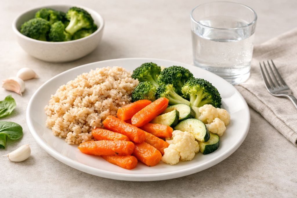 Lunch: brown rice bowl with lentils or chickpeas and cooked vegetables