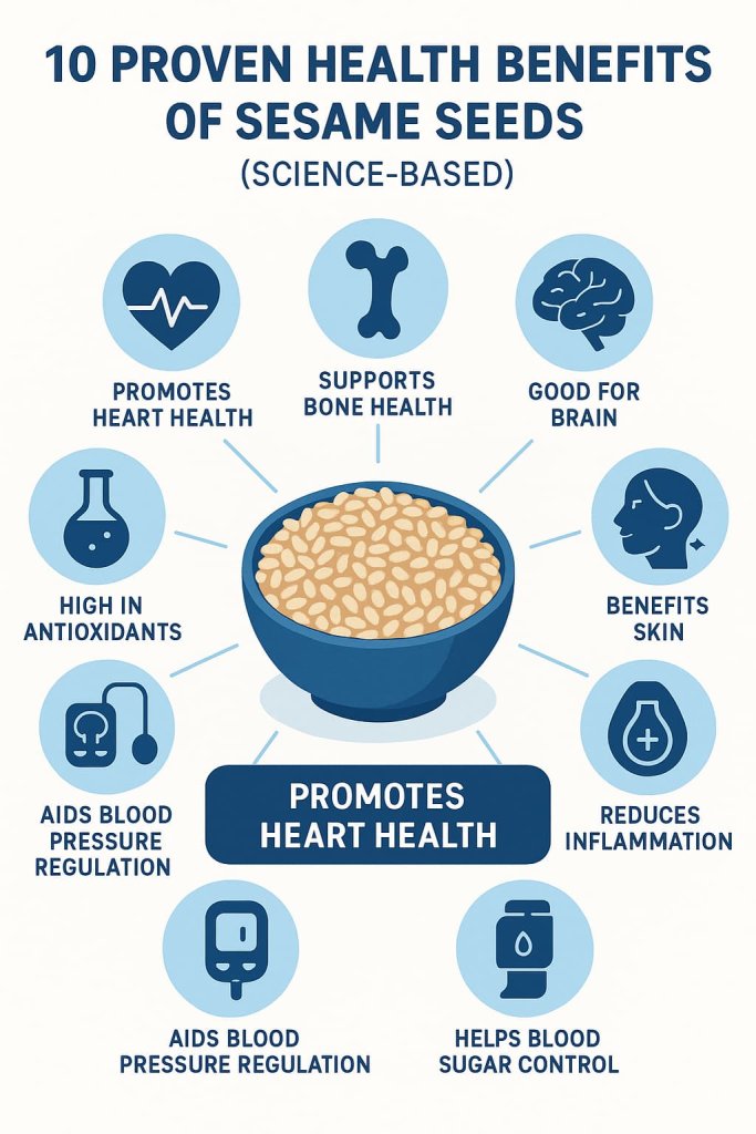 Sesame seeds are tiny but nutrient-rich powerhouses that contribute to heart, bone, immune, and brain health. Supported by modern research, these benefits are attributed to sesame’s unique combination of healthy fats, lignans (sesamin and sesamolin), plant protein, vitamins, and essential minerals. Below are 10 science-backed benefits explained in detail, with evidence from credible sources and health authorities.