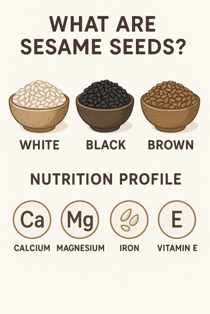 Sesame seeds are among nature’s most concentrated sources of healthy fats, minerals, and plant antioxidants — supporting heart, bone, immune, and skin health. Their versatility makes them an easy addition to both savory and sweet dishes.