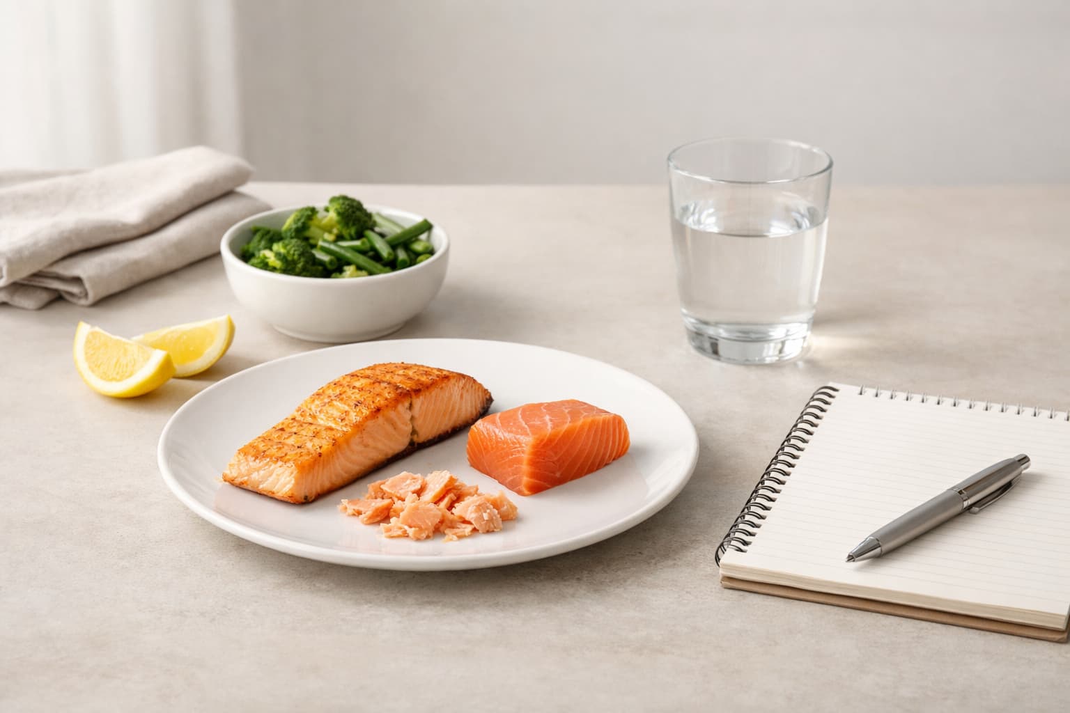 For a simple visual guide, a 3-ounce cooked serving of salmon is about the size of a deck of cards or the palm of your hand without the fingers. That can help readers estimate portions more realistically when they are not weighing food.