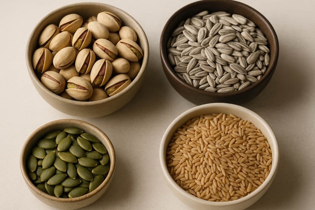 Nuts and seeds—including pistachios, sunflower seeds, and pumpkin seeds—offer moderate potassium levels along with healthy fats and fiber. Whole grains and starchy roots such as taro or brown rice also contribute smaller but consistent amounts of potassium. These foods can be combined with higher-potassium options to help support an overall balanced nutrient pattern. Their versatility makes them easy to incorporate into snacks, salads, and main meals, offering steady nutritional value throughout the day.