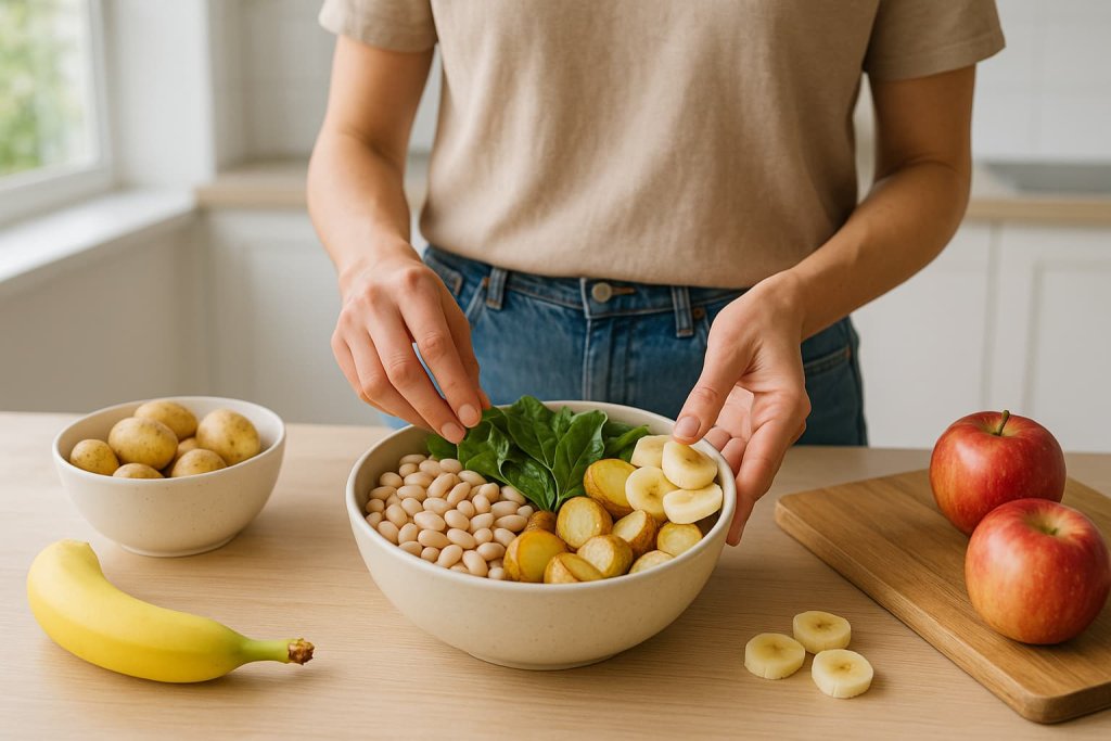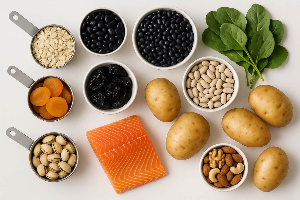 Pairing potassium-rich foods with complementary ingredients helps support balanced meals. For example, beans and whole grains create a fiber-rich foundation, while leafy greens paired with fish or yogurt contribute minerals and protein. Mixing moderate-potassium foods (such as nuts or whole grains) with higher-potassium options (such as potatoes or certain fruits) helps spread intake throughout the day in a sustainable, nutrient-centered way. This approach aligns with guidance from the National Institutes of Health, which recommends obtaining potassium through varied, whole-food dietary patterns.