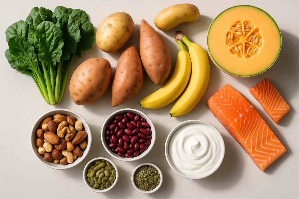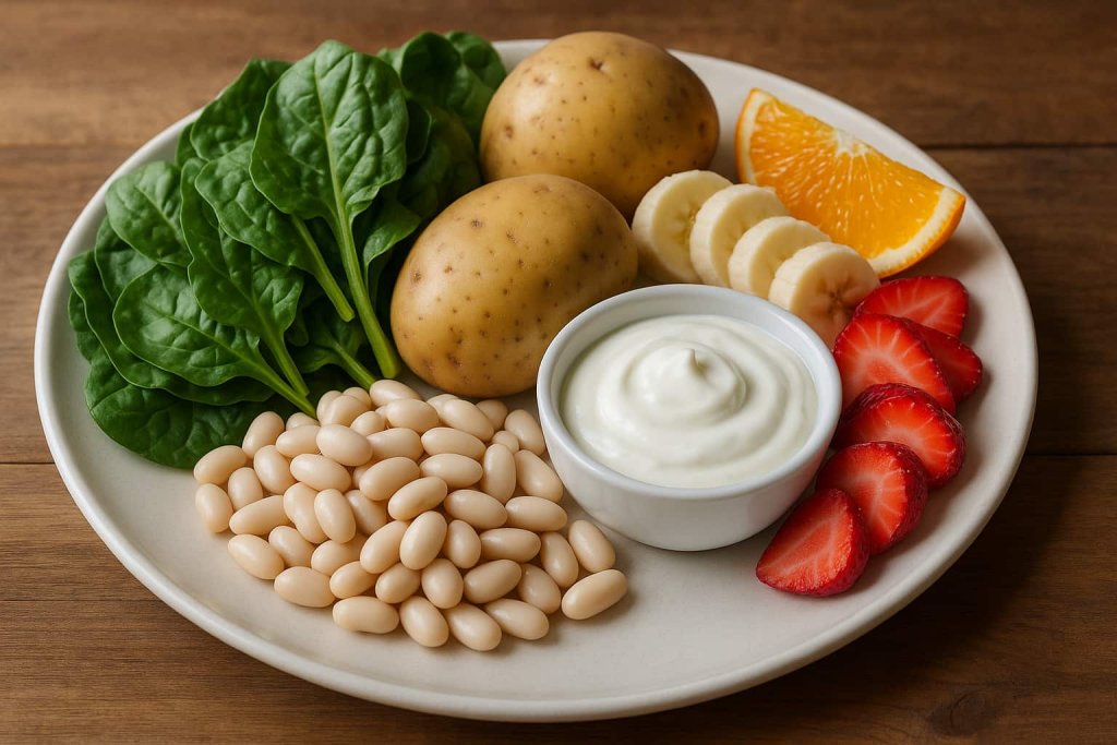 Incorporating potassium-rich foods into daily meals can be simple and flexible. Adding cooked leafy greens to omelets or grain bowls provides a strong potassium foundation early in the day. A baked potato or sweet potato can serve as a nutrient-dense side dish at lunch or dinner. Beans can be added to soups, salads, and stews for an easy potassium boost. For snacks, pairing fruit such as bananas, cantaloupe, or dried apricots with yogurt offers a balanced combination of potassium, fiber, and protein. According to the Dietary Guidelines for Americans, distributing nutrient-rich foods across meals helps support overall dietary quality.