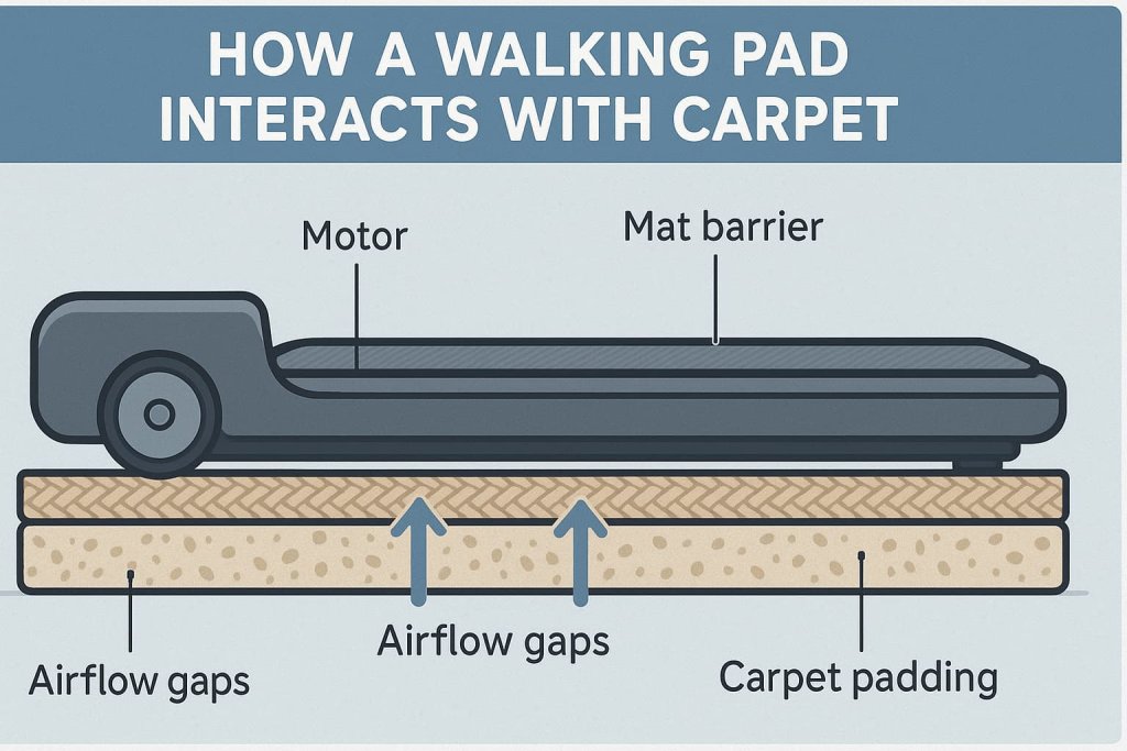 According to MotionGrey Fitness (2024) and Garage Gym Reviews, carpets with thick padding or long fibers can block air vents and lead to heat buildup, which shortens motor life.
