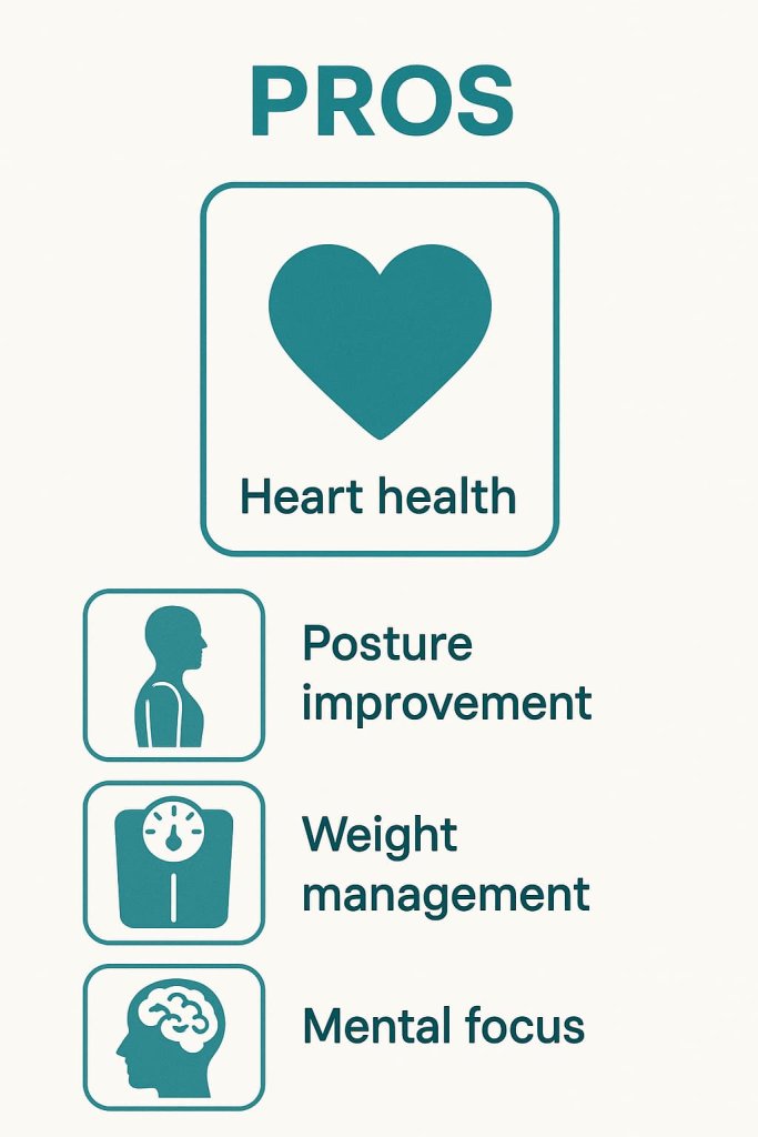 WebMD reports that walking promotes alertness, better mood, and reduced stress — ideal for professionals working long desk hours. Many users find they type and brainstorm more effectively while walking at a slow pace (1–1.5 mph).