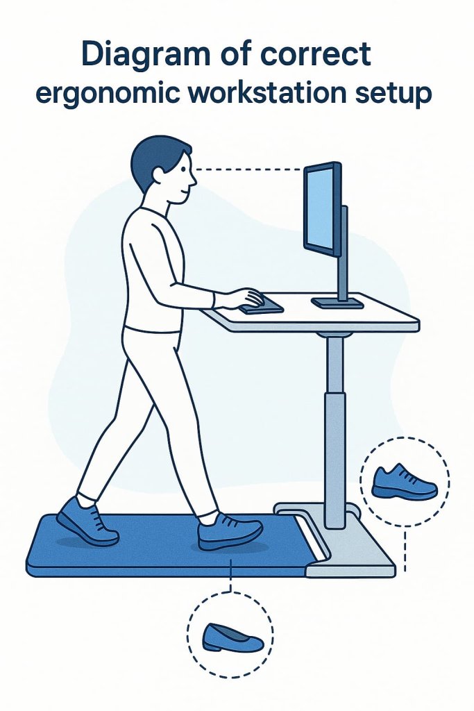 Position your monitor at eye level and keep your shoulders relaxed to prevent neck and upper back strain. Maintain a natural stride — don’t overstep or lean forward when walking.