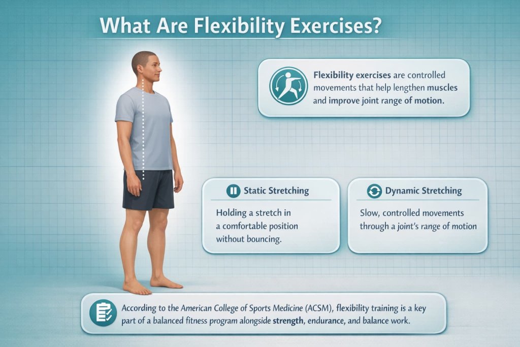 Flexibility exercises are movements designed to lengthen muscles and improve joint range of motion. They are usually performed slowly, with control, and without momentum.