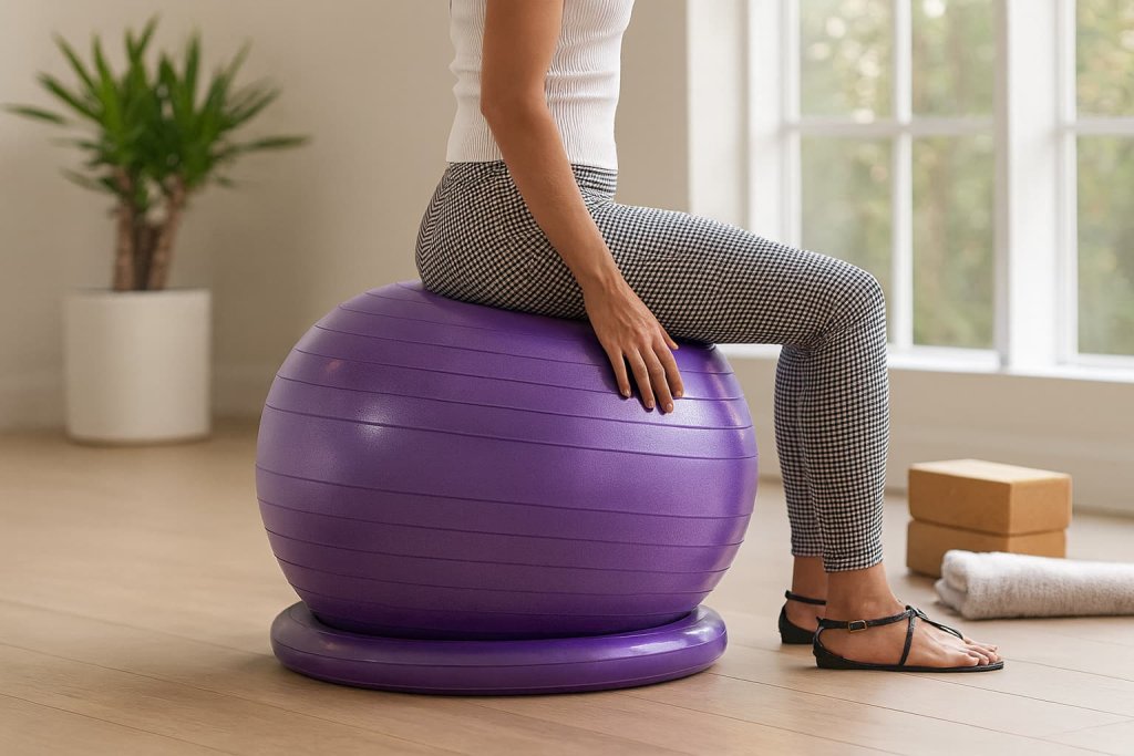 Most adults use 55–65 cm balls. If you are under 5’4″, choose a smaller ball; if you are above 5’11”, consider 70–75 cm models. Proper knee-hip alignment (hips slightly above knees) is essential for safe posture.